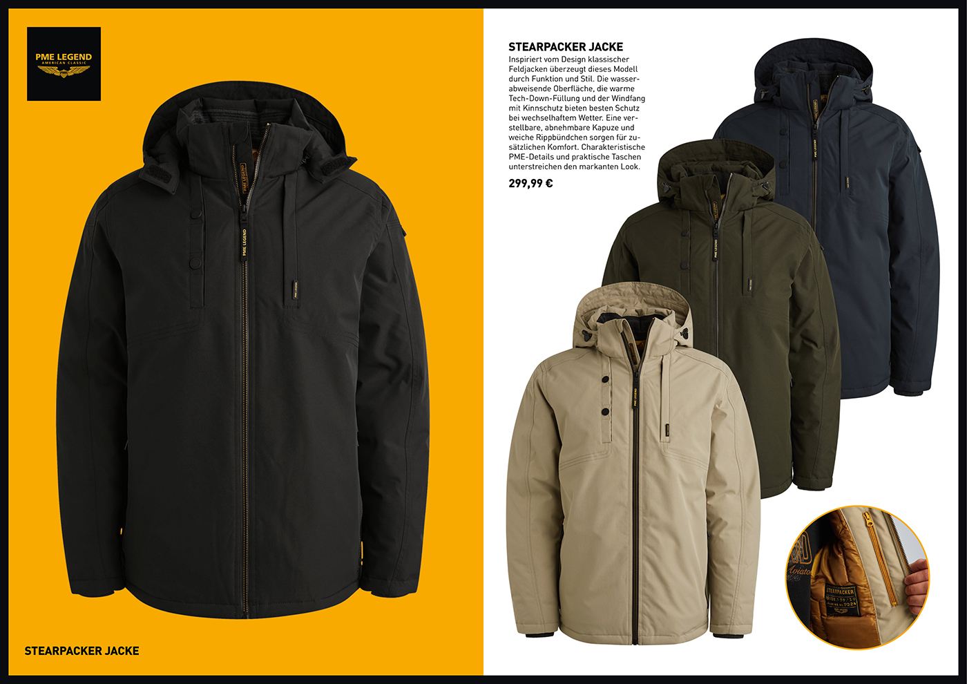 Die PME Legend Stearpacker Jacke ist von einer authentischen 1965 Feldjacke inspiriert. Die Tech Down‑Füllung und die abnehmbare, verstellbare Kapuze machen diese wasserabweisende Jacke ideal für verschiedene Wetterbedingungen. Die Rippbündchen und der Windfang mit Kinnschutz sorgen für zusätzliche Wärme und Komfort. Die Jacke verfügt über zwei Seitentaschen mit Reißverschluss und Fleecefutter, eine Brusttasche mit Reißverschluss und zwei Innentaschen mit Reißverschluss. Die charakteristischen PME Legend‑Details, wie das abnehmbare Band am Ärmel, runden das Design ab.