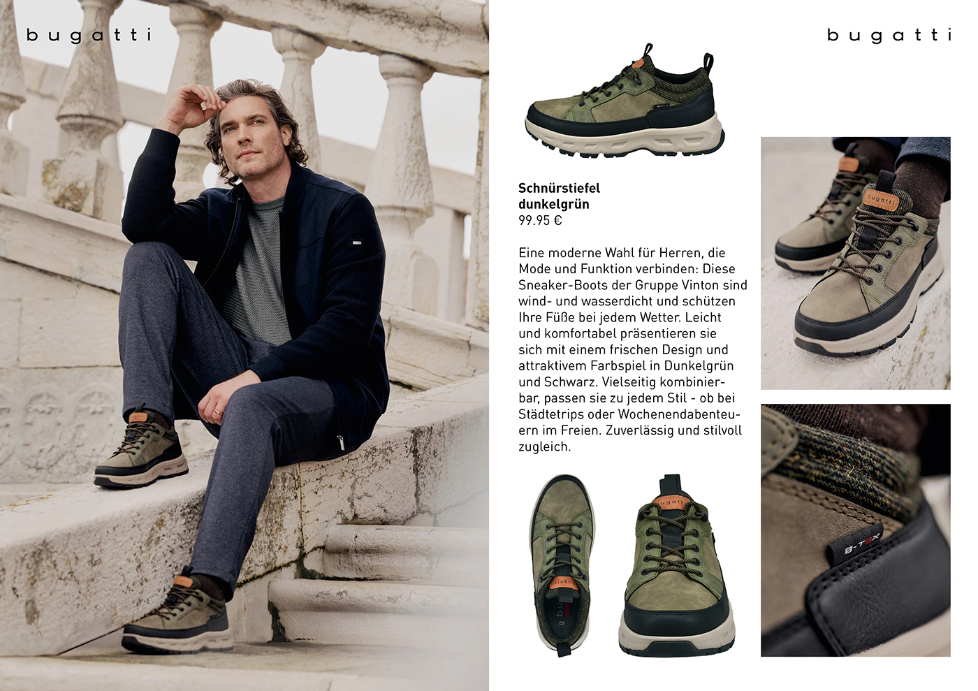 Eine moderne Wahl für Herren, die Mode und Funktion verbinden: Diese Sneaker-Boots der Gruppe Vinton sind wind- und wasserdicht und schützen Ihre Füße bei jedem Wetter. Leicht und komfortabel präsentieren sie sich mit einem frischen Design und attraktivem Farbspiel in Dunkelgrün und Schwarz. Vielseitig kombinierbar, passen sie zu jedem Stil - ob bei Städtetrips oder Wochenendabenteuern im Freien. Zuverlässig und stilvoll zugleich.